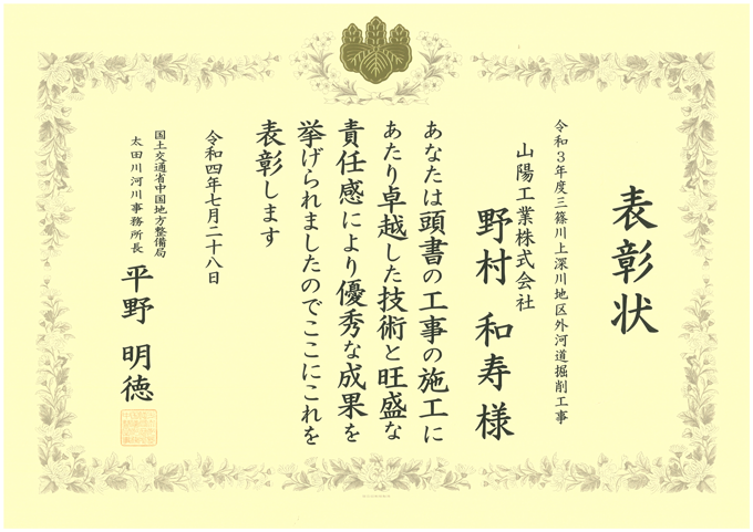 国土交通省中国地方整備局太田川河川事務所から「優良工事施工団体表彰」及び「優秀建設技術者表彰」を受賞(受賞工事:令和3年度三篠川上深川地区外河道掘削工事)