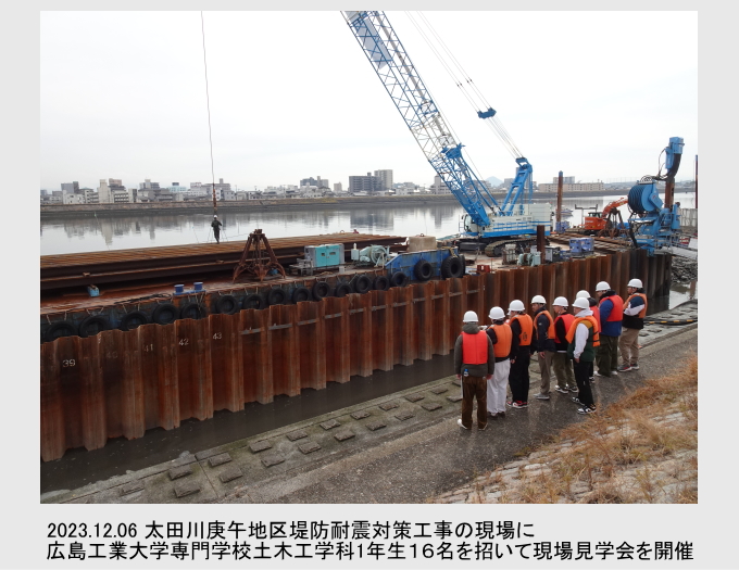 太田川庚午地区堤防耐震対策工事の現場に広島工業大学専門学校土木工学科1年生16名を招いて現場見学会を開催