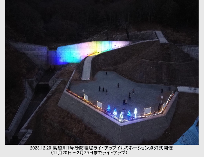 鳥越川1号砂防堰堤ライトアップイルミネーション点灯式開催(12月20日〜2月29日までライトアップ)